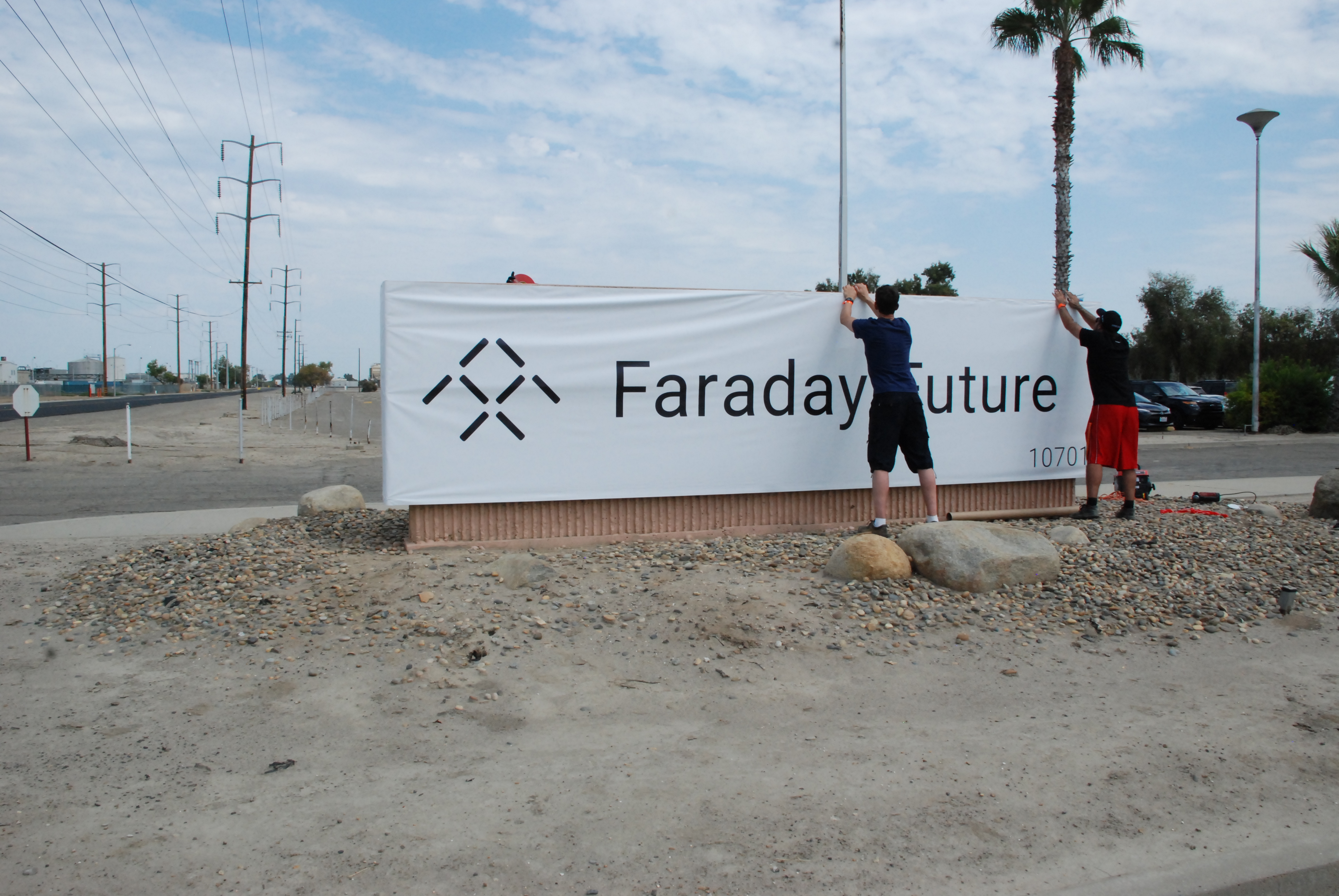 Employees from startup electric car manufacturer Faraday Future put up a temporary sign Saturday in front of the factory the company leased in south Hanford to become its first manufacturing plant.