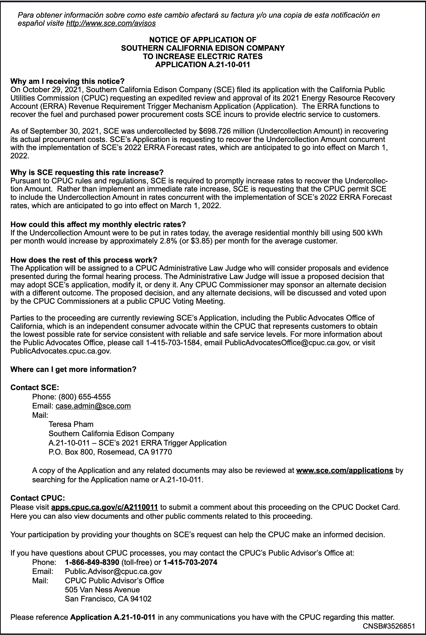 NOTICE OF TRUSTEE’S SALE TS No. CA-19-868434-RY Order No.: 191085125-CA-VOI YOU ARE IN DEFAULT UNDER A DEED OF TRUST DATED 3/30/2007. UNLESS YOU TAKE ACTION TO PROTECT YOUR PROPERTY, IT MAY BE SOLD AT A PUBLIC SALE. IF YOU NEED AN EXPLANATION OF THE NATURE OF THE PROCEEDING AGAINST YOU, YOU SHOULD CONTACT A LAWYER. A public auction sale to the highest bidder for cash, cashier’s check drawn on a state or national bank, check drawn by state or federal credit union, or a check drawn by a state or federal savings and loan association, or savings association, or savings bank specified in Section 5102 to the Financial Code and authorized to do business in this state, will be held by duly appointed trustee. The sale will be made, but without covenant or warranty, expressed or implied, regarding title, possession, or encumbrances, to pay the remaining principal sum of the note(s) secured by the Deed of Trust, with interest and late charges thereon, as provided in the note(s), advances, under the terms of the Deed of Trust, interest thereon, fees, charges and expenses of the Trustee for the total amount (at the time of the initial publication of the Notice of Sale) reasonably estimated to be set forth below. The amount may be greater on the day of sale. BENEFICIARY MAY ELECT TO BID LESS THAN THE TOTAL AMOUNT DUE. Trustor(s): JOHN J LAGO AND DENISE K LAGO, HUSBAND AND WIFE, AS JOINT TENANTS Recorded: 4/6/2007 as Instrument No. 2007-0069458 of Official Records in the office of the Recorder of FRESNO County, California; Date of Sale: 11/24/2021 at 9:00 AM Place of Sale: At the Fresno Superior Courthouse, 1100 Van Ness Avenue, Fresno, CA 93724. At the West Entrance to the County Courthouse Breezeway Amount of unpaid balance and other charges: $239,984.93 The purported property address is: 41578 CHIPMUNK LANE, AUBERRY, CA 93602 Assessor’s Parcel No.: 128-242-16 NOTICE TO POTENTIAL BIDDERS: If you are considering bidding on this property lien, you should understand that there are risks involved in bidding at a trustee auction. You will be bidding on a lien, not on the property itself. Placing the highest bid at a trustee auction does not automatically entitle you to free and clear ownership of the property. You should also be aware that the lien being auctioned off may be a junior lien. If you are the highest bidder at the auction, you are or may be responsible for paying off all liens senior to the lien being auctioned off, before you can receive clear title to the property. You are encouraged to investigate the existence, priority, and size of outstanding liens that may exist on this property by contacting the county recorder’s office or a title insurance company, either of which may charge you a fee for this information. If you consult either of these resources, you should be aware that the same lender may hold more than one mortgage or deed of trust on the property. NOTICE TO PROPERTY OWNER: The sale date shown on this notice of sale may be postponed one or more times by the mortgagee, beneficiary, trustee, or a court, pursuant to Section 2924g of the California Civil Code. The law requires that information about trustee sale postponements be made available to you and to the public, as a courtesy to those not present at the sale. If you wish to learn whether your sale date has been postponed, and, if applicable, the rescheduled time and date for the sale of this property, you may call 800-280-2832 for information regarding the trustee’s sale or visit this internet website http://www.qualityloan.com, using the file number assigned to this foreclosure by the Trustee: CA-19-868434-RY. Information about postponements that are very short in duration or that occur close in time to the scheduled sale may not immediately be reflected in the telephone information or on the internet website. The best way to verify postponement information is to attend the scheduled sale. NOTICE TO TENANT: You may have a right to purchase this property after the trustee auction pursuant to Section 2924m of the California Civil Code. If you are an “eligible tenant buyer,” you can purchase the property if you match the last and highest bid placed at the trustee auction. If you are an “eligible bidder,” you may be able to purchase the property if you exceed the last and highest bid placed at the trustee auction. There are three steps to exercising this right of purchase. First, 48 hours after the date of the trustee sale, you can call 800-280-2832, or visit this internet website http://www.qualityloan.com, using the file number assigned to this foreclosure by the Trustee: CA-19-868434-RY to find the date on which the trustee’s sale was held, the amount of the last and highest bid, and the address of the trustee. Second, you must send a written notice of intent to place a bid so that the trustee receives it no more than 15 days after the trustee’s sale. Third, you must submit a bid so that the trustee receives it no more than 45 days after the trustee’s sale. If you think you may qualify as an “eligible tenant buyer” or “eligible bidder,” you should consider contacting an attorney or appropriate real estate professional immediately for advice regarding this potential right to purchase. The undersigned Trustee disclaims any liability for any incorrectness of the property address or other common designation, if any, shown herein. If no street address or other common designation is shown, directions to the location of the property may be obtained by sending a written request to the beneficiary within 10 days of the date of first publication of this Notice of Sale. If the sale is set aside for any reason, including if the Trustee is unable to convey title, the Purchaser at the sale shall be entitled only to a return of the monies paid to the Trustee. This shall be the Purchaser’s sole and exclusive remedy. The purchaser shall have no further recourse against the Trustor, the Trustee, the Beneficiary,