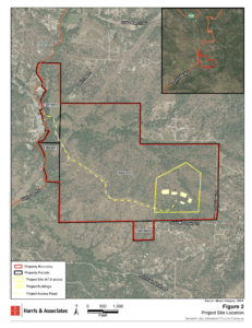 Site access would be provided by a new approximately one-mile-long, 24-foot-wide paved private road extending east from Tollhouse Road, with an emergency access route available via Quail Mountain Lane. The access driveway would terminate at a centrally located circular drop-off area near the campus buildings, and a designated loading zone would be located on the north side of the multi-purpose building (Building C).