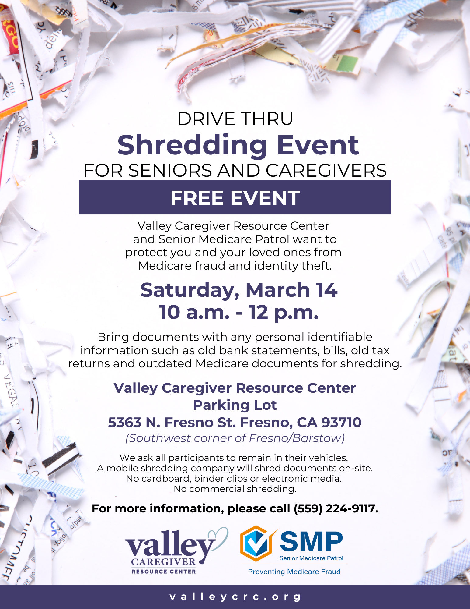 Valley Caregiver Resource Center and Senior Medicare Patrol are hosting a FREE Drive Thru Shredding Event for Seniors & Caregivers